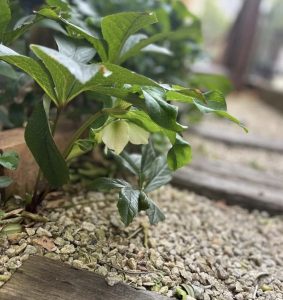 駐車場からの小道に植えているクリスマスローズが花を付けました。